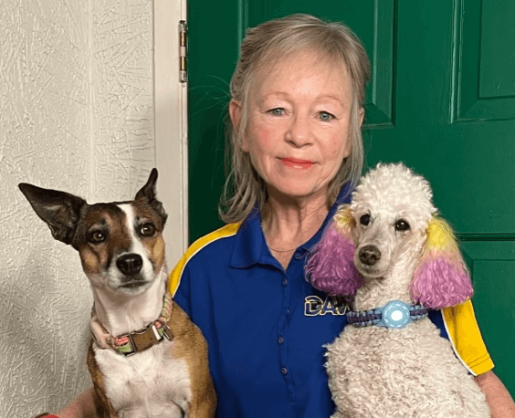 TC brings a very unique perspective to training. In addition to being involved with agility for over 25 years, she also trains and competes in flyball, obedience, trick dogs, and freestyle dog dancing. She mentors those working with therapy dogs, and has frequently performed with her dogs at the Great State Fair of Texas! Because of her in-depth background, she adds creativity to DAWG’s Beginner Level courses. She places emphasis on games and making the training process fun. Her pack members include Bazinga, an All-American, and Latté, a miniature Poodle.